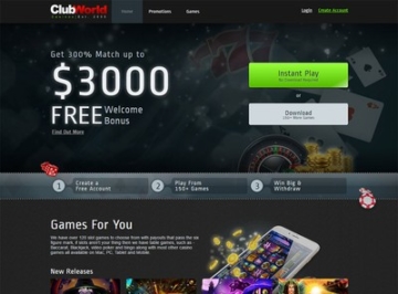 ClubWorld has a double welcome bonus. Players get a bonus to use on slots and another to use on table games. There is an additional $75 chip extra for players whop deposit with Mastercard or Bitcoin.